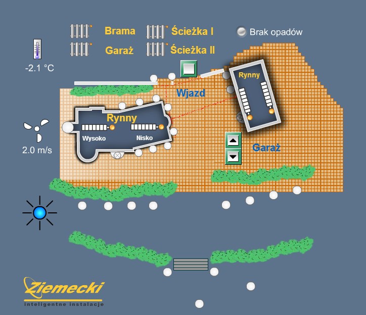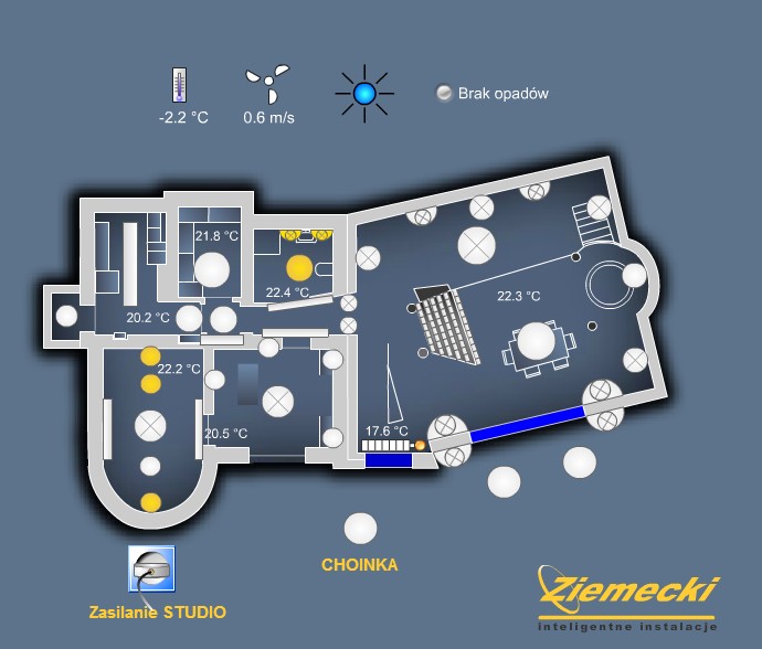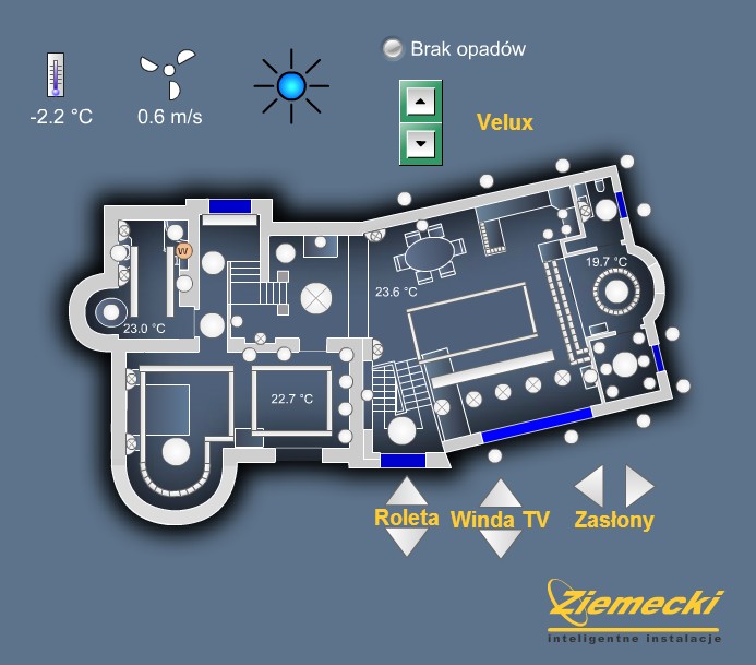 Realizacja trudna, ze względu na chaotycznie poprowadzone okablowanie obiektu. Finalnie, udało się uruchomić system LCN (okablowanie uniemożliwiało odpalenie KNXa) wraz z serwerem zarządzania iBMS. Zamieszczamy kilka fotek z wizualizacji wykonanej przez naszą firmę na serwer Signum.